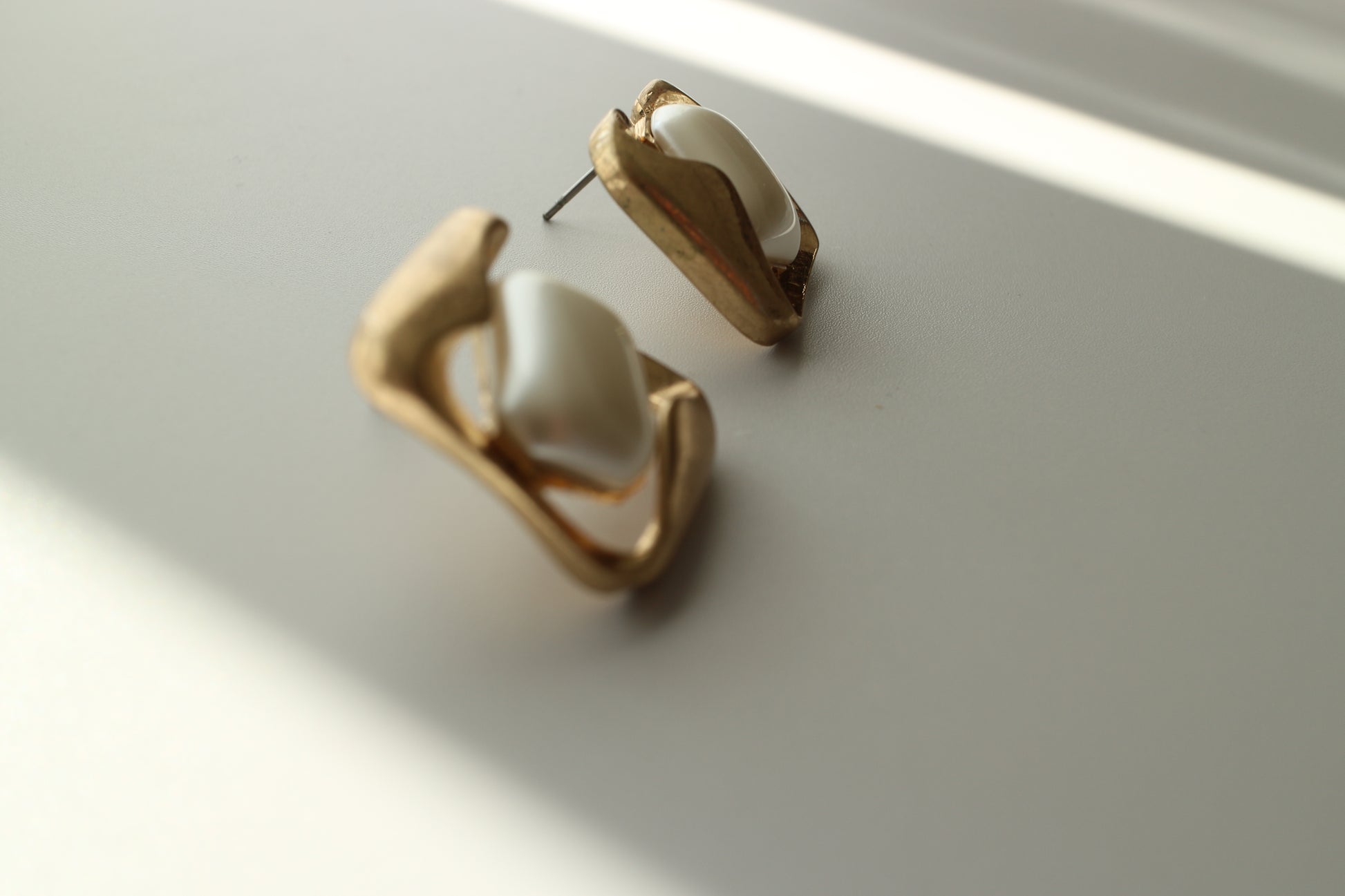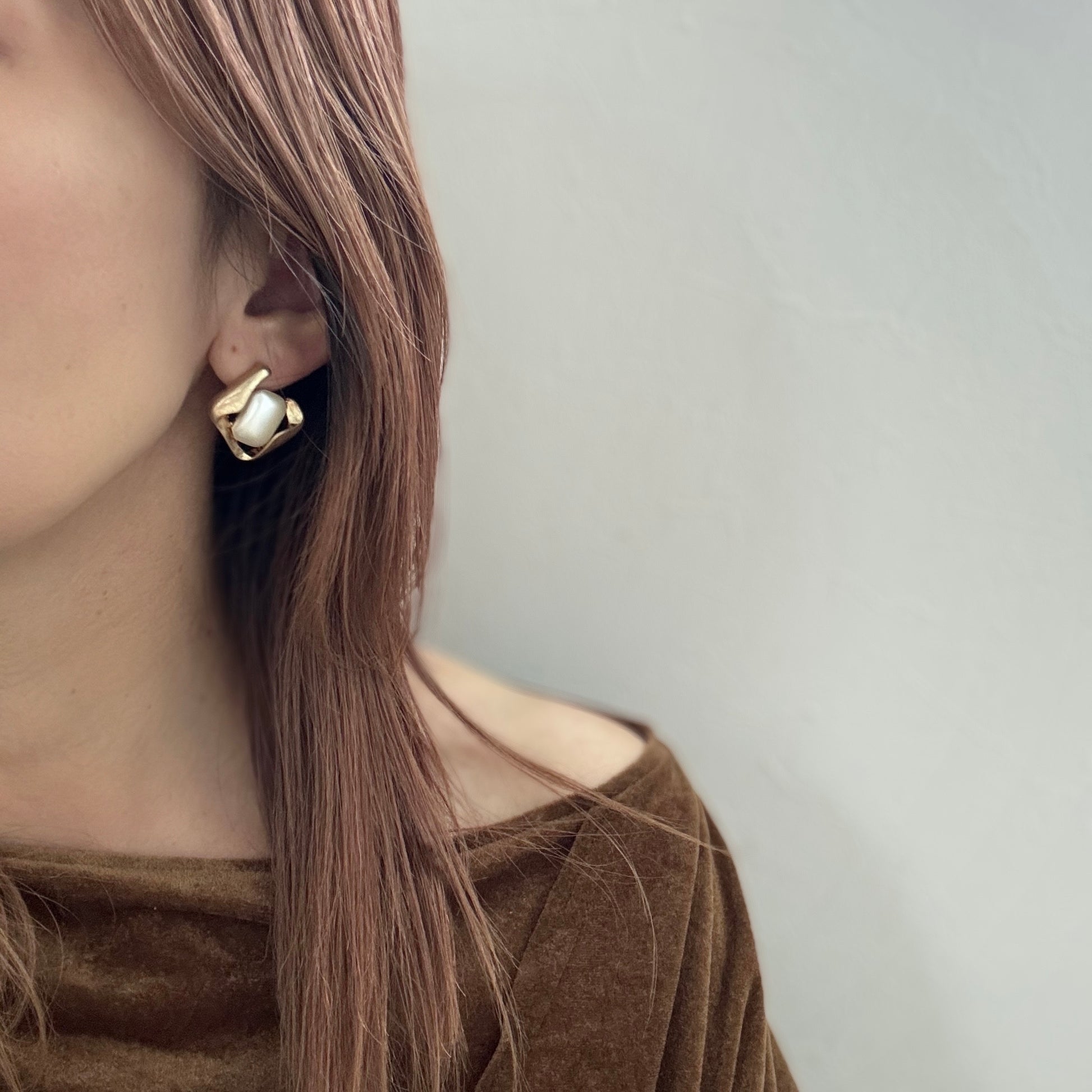 マットにすり減ったようなさらりとした質感のメタルフレームが、長い年月を経たような深みを感じさせるイヤリング。
